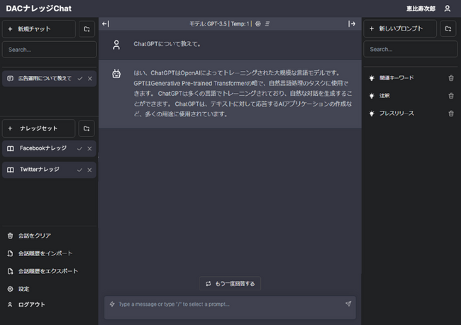 生成AIは、マーケティングの様々な領域で活用が期待されていますが、一方で、実際にChatGPTなどを企業内で活用するにあたっては、AIへの指示テキストであるプロンプト(※2)に含まれる機密情報の取り扱いや、社内でのプロンプトテンプレート共有の仕組み作り、専門知識への対応など、多くの課題があります。DACでは、こうした課題の解決を目指し、DACが持つ独自のデジタルマーケティングナレッジを活用可能なAIソリューションを開発し、社内での運用を開始しました。また併せて、生成AIを効果的に活用するための専門チームを設け、必要な情報の整備や利用者への教育等も行います。