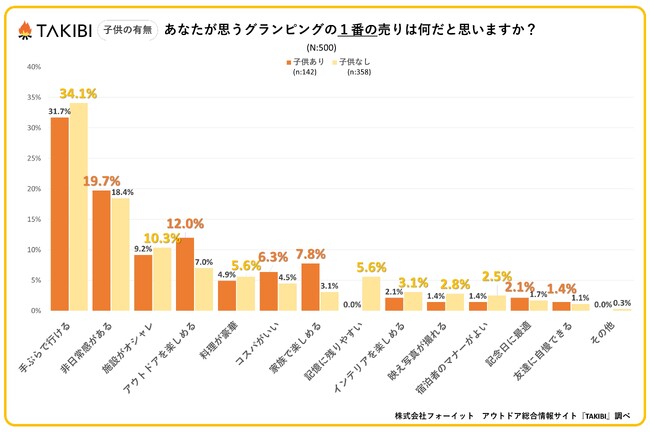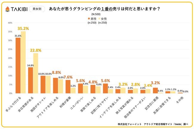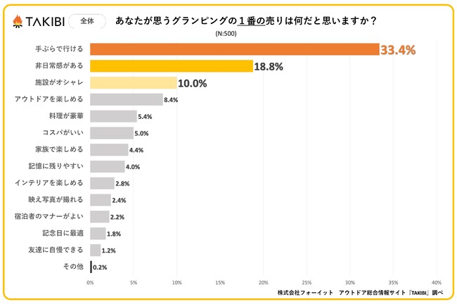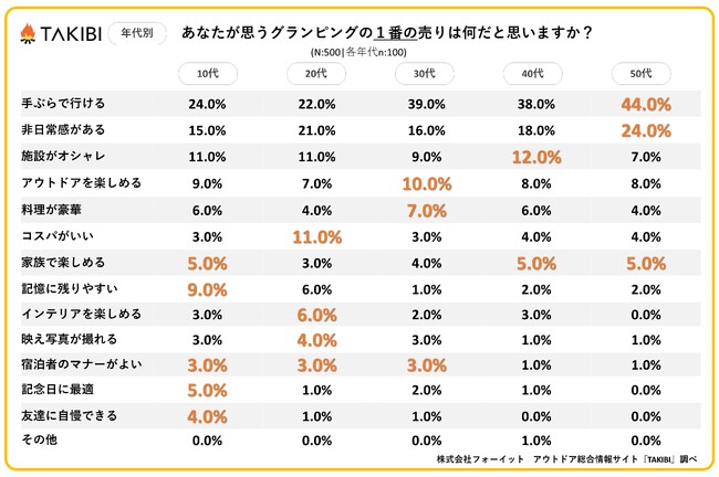 キャンプやグランピングを中心としたアウトドア総合情報サイト「TAKIBI」の運営をおこなう株式会社フォーイットは、全国の10代~50代までの男女500人を対象にグランピングの売りに関するアンケートを実施し、男女別・年代別等の特徴についてまとめました。