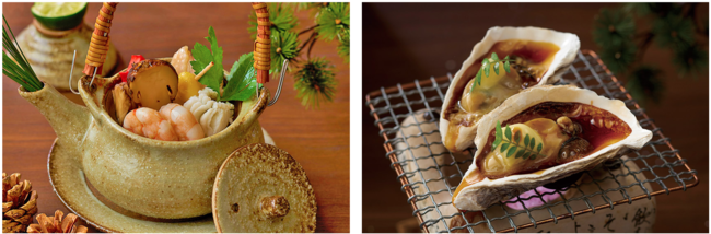 左:山下家、秋の名物メニュー「松茸土瓶蒸し」。土瓶に出汁を張ってテーブルで炊き上げて。温かな湯気と立ち昇る香り、そして具材の旨味が染み出た出汁をじっくりとご堪能ください。