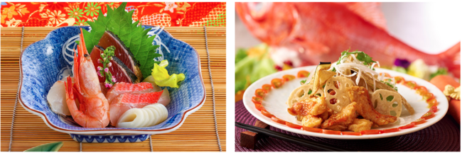 右:金目鯛を使った中華の一品「金目鯛の唐揚げ 中華風香味だれ」。ふわふわの身とからりと揚がった衣に甘辛のたれが絡む、お箸の止まらなくなる美味しさをご賞味ください。