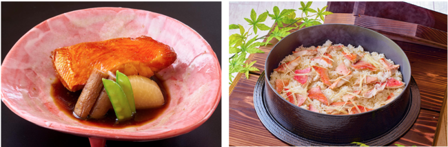 右:朝食でご提供する「金目鯛の炊き込みご飯」。金目鯛の上品な白身、旨味が染み込んだお米を楽しむ炊き込みご飯です。二膳目は出汁をかけてお茶漬けスタイルで。豊富な具材で思い思いのアレンジで楽しめる「大江戸のっけ丼」もお見逃しなく。