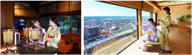 落ち着いた雰囲気の中で加賀棒茶やお菓子、アルコールを楽しめるメインラウンジの他に、最上階の展望ラウンジでも、湯上りに生ビールやハイボールを無料でお楽しみいただける山下家。