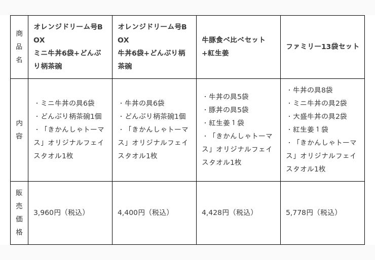 「きかんしゃトーマス」のオリジナルフェイスタオル(34cm×35cm)が付属した限定セットは4種類です。「オレンジドリーム号BOX ミニ牛丼6袋+どんぶり柄茶碗」(税込3,960円)と「オレンジドリーム号BOX 牛丼6袋+どんぶり柄茶碗」(税込4,400円)は吉野家のキッチンカー「オレンジドリーム号」をデザインしたギフトBOXでお届けします。