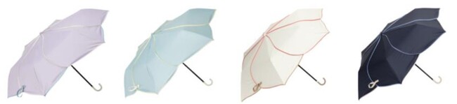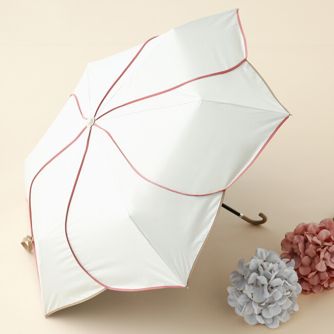 シンプルな配色で広げると花びらのようなエレガントなフォルムが目を引くデザインの日傘です。雨の日も、晴れの日もお使いいただける晴雨兼用タイプ。遮光率・UVカット率ともに99.9%で、紫外線の多い時期にも心強いアイテムです。生地の裏面にポリウレタンコーティング加工を施し、生地の目をしっかりと埋めているので、UVカット・遮光・耐水性に優れています。