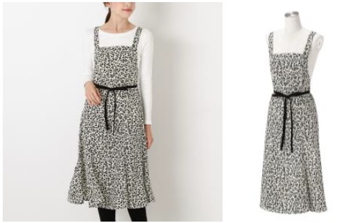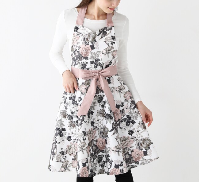 モノクロの小花柄が大人っぽいエプロンです。柔らかくさらっとした上質な触り心地で、スカートの裾部分がヒラヒラと揺れてワンピースのように着れる魅力的な1枚。