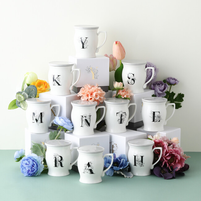 使いやすい形のマグカップに、イニシャルで始まるお花をデザインした、フタ付きのマグカップです。フタはティーバッグを置いたり、コースターとしてもお使いいただけます。A:Amaryllis(アマリリス)/E:Edelweiss(エーデルワイス)/H:Hyacinth(ヒヤシンス)/K:Kamille(カモミール)/M:Magnolia(マグノリア)/N:Nemophila(ネモフィラ)/R:Ranunculus(ラナンキュラス)/S:Saintpaulia(セントポーリア)/T:Tulip(チューリップ)/Y:Ylang-ylang(イランイラン)