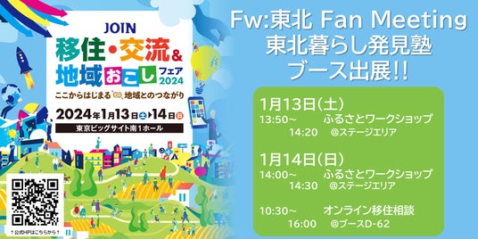 エイチタス株式会社(本社:東京都品川区、代表取締役:原 亮/小澤 剛)が企画運営を行う「Fw:東北(フォワードとうほく) Fan Meeting」(復興庁主催)では、1月13日~14日に開催される「JOIN 移住・交流&地域おこしフェア2024」へブース出展いたします。
