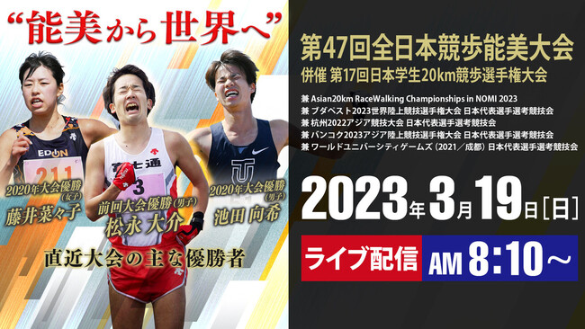 2023年3月19日(日)、「第47回全日本競歩能美大会」をYouTube「日テレSports」にてライブ配信することが決定いたしました!