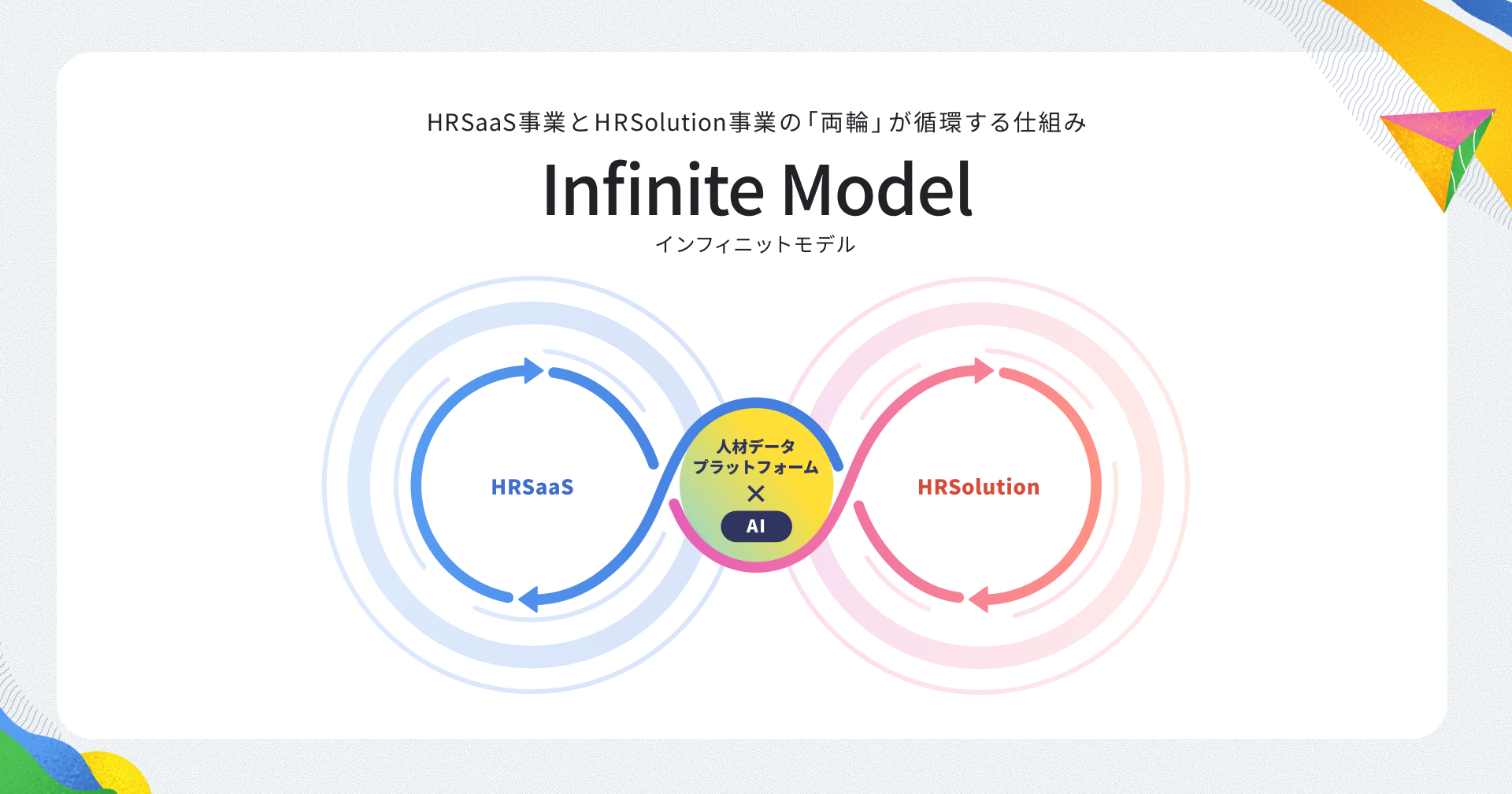 当社は、新ビジョンを実現するために「HRSaaS事業」と「HRSolution事業」の両輪が循環する「Infinite Model」を確立します。