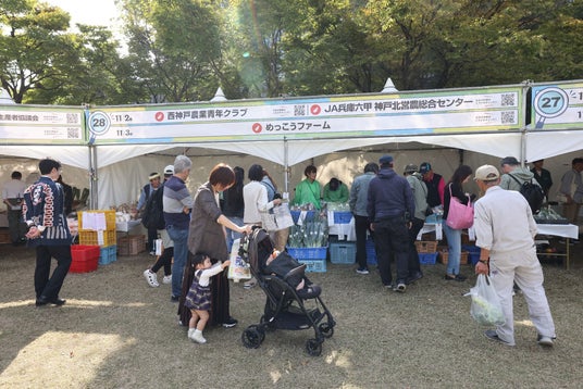 物販コーナーには、人と環境に配慮した栽培方法で生産された近郊産地ならではの鮮度抜群の野菜を提供する「JA兵庫六甲 こうべ旬菜部会」や、「西区若手有機農家チーム」など約10の出展者がラインナップ。ブースにずらりと並ぶ新鮮な野菜は大盛況でした。「この野菜めっちゃ安いね!」「この野菜はこうやって食べたら美味しいよ」など、生産者と来場者が楽しそうに会話しながら買い物をする姿が見られました。購入した方に話を聞くと「グルメを目当てに来たけど、産地直送・安心安全の野菜をリーズナブルに買うことができて嬉しかった」と話してくださいました。