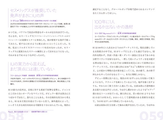 ♦さらに、歌手・作曲家・作詞家・ボーカルトレーナー・音楽科教授など、音楽の第一線で活躍するプロフェッショナルたちへの取材を通して、IUというアーティストの凄みと唯一無二の魅力を多角的に描き出す。