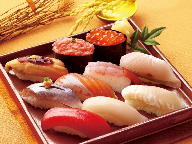 【商品内容】 秋の旬ネタ5貫(秋刀魚・平目・かんぱち・赤いか・とろサーモン)、まぐろ赤身、ねぎとろ、いくら、柚子ふり穴子、甘海老