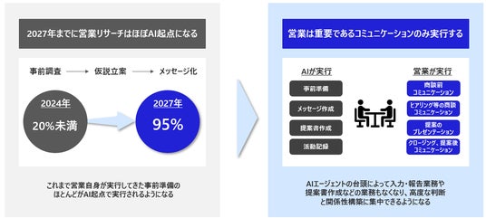 本提携では、AI時代における営業の役割を「顧客コミュニケーションに集中することによる成果の最大化」と定義し、「AIを使いこなす」のではなく「営業に当たり前にAIを装着する」ことで、業務生産性を高めることを目指します。