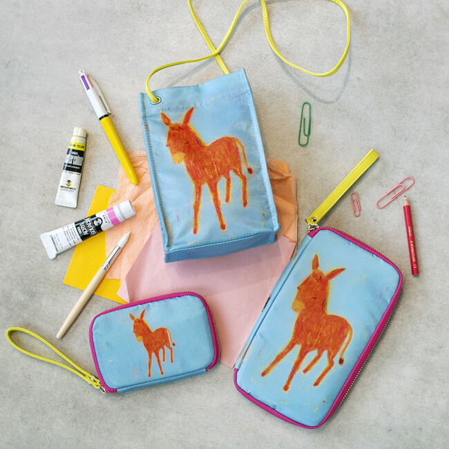 絵本作家の荒井良二さんに、「ほぼ日手帳2014」のカバーのために描いていただいた絵「いつでも話を聞きますよとロバが言います。」が、ひきだしポーチとなって生まれ変わりました。水色の背景にたたずむのは、やさしい表情をした、オレンジ色のロバ。名前のとおり、このポーチのロバがいつもあなたのそばにいて、何でも話を聞いてくれそうです。
