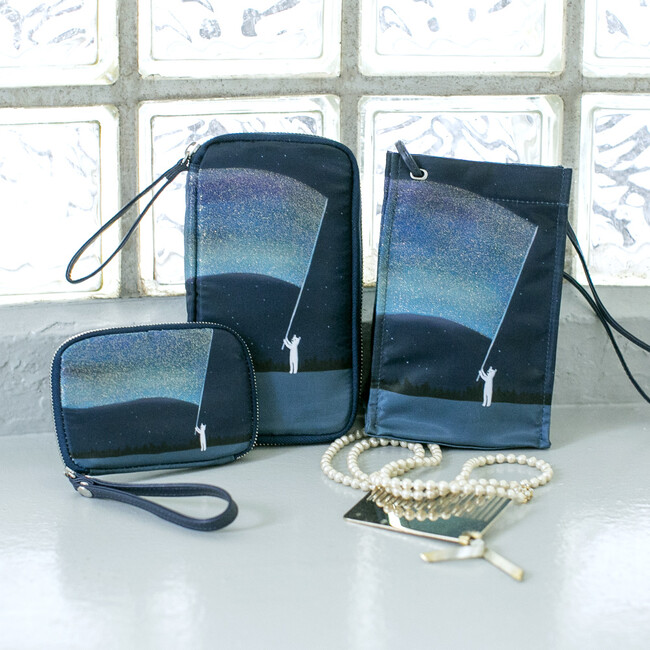 「ほぼ日手帳2023」weeks英語版でも登場して人気だった「オーロラ当番」が、ひきだしポーチになりました。静かな夜、どこか北の国の空の下で、白い熊が「オーロラ当番」として空にオーロラをかけています。うしろ側には、あたたかい飲み物を差し入れにやってきたもう一頭の熊が。夜空に輝く美しいオーロラは、ラメを使って表現しました。