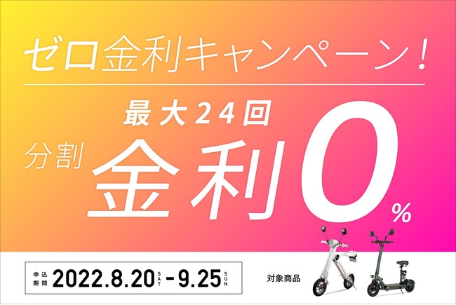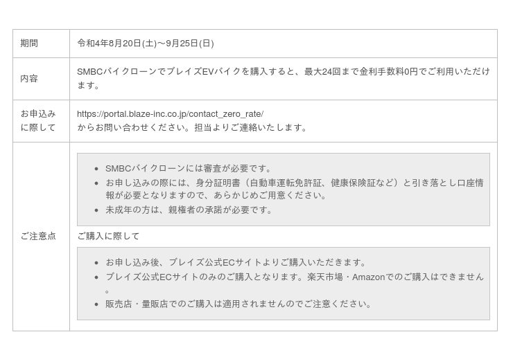 EVモビリティメーカーの株式会社ブレイズ(愛知県名古屋市、代表取締役:市川秀幸)は、令和4年8月20日(土)から9月25日(日)の期間、電動バイク「ブレイズスマートEV」または「ブレイズEVスクーター」をローンでご購入のお客様に対して、利息分をブレイズが負担する「ゼロ金利キャンペーン」を実施いたします。