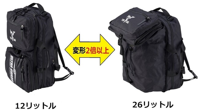 上蓋を変形させると12L(リットル)から26L(リットル)と2倍以上に収納力がアップします。突然荷物が増えても対応できます。