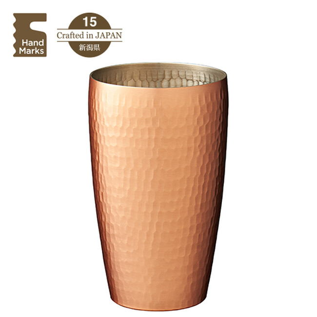 表面は鎚目模様でツヤ消しの重厚感ある仕上がりのタンブラー。冷たい飲み物を注ぐとカップ全体が冷たくなり、一口目から喉元に冷たさが伝わります。オリジナルデザインのパッケージ付きでギフトにおすすめです。