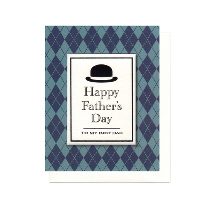 黒箔で印刷された高級感のあるラベルが特長の、ブルーのアーガイル模様と山高帽がカワイイ父の日ミニカード。