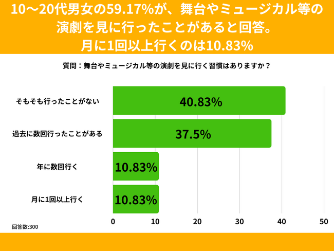 10~20代男女を対象とした「舞台やミュージカル等の演劇を見に行く習慣はありますか?」というアンケートで最も多かった回答は「そもそも行ったことがない」で40.83%でした。