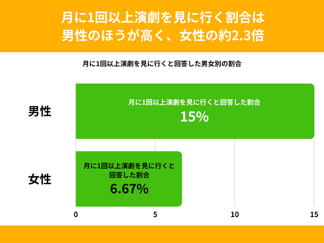 月に1回以上演劇を見に行くと回答した割合を男女別でみてみますと、男性が15%、女性が6.67%という結果になりました。