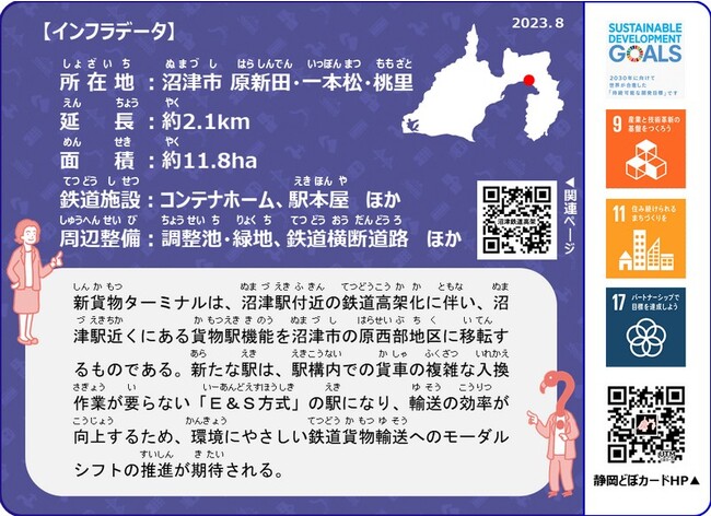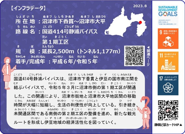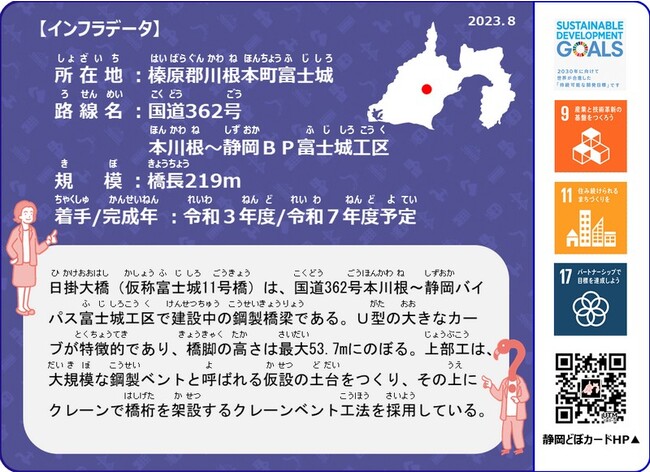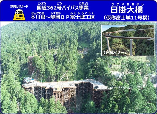 静岡県では、暮らしを支える影の立役者である社会インフラのことを知ってもらい、その整備や維持管理が理解、信頼されることを目的として、ダイナミックで特徴的な土木構造物等を掲載した「静岡どぼカード」の発行、配布を行っています。