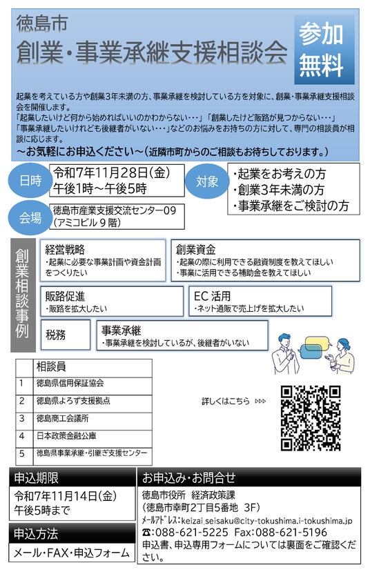 徳島市創業促進支援事業の一環として、専門家による個別相談会を開催します。