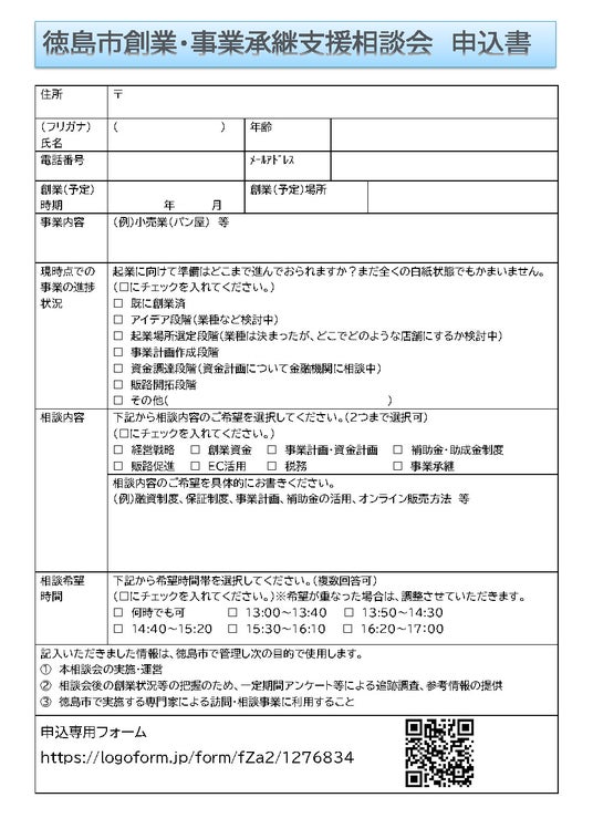 申込書に必要事項を記入して、徳島市経済政策課にメール、FAX、申込フォームのいずれかでお申込みください。(徳島市HP参照)