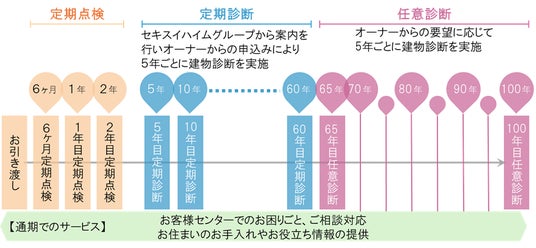 新サービス『100年・長期サポートシステム』(※1)は、この定期点検・定期診断の仕組みを引渡し後100年目まで延長するものです。本サービスは、2026年よりオーナーへの案内を始め、2031年より本格的なサービス提供を開始します。