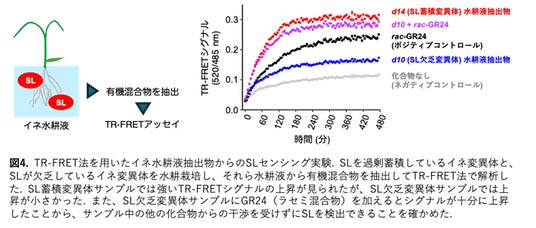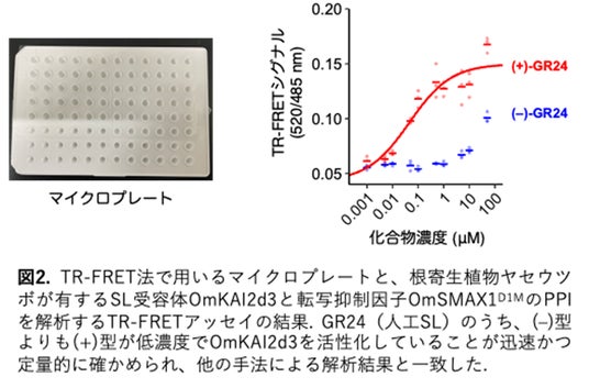 本研究グループは、SLが誘導するPPIを迅速かつ定量的に測定する手法を開発することで、SLやSL受容体の詳細な機能解析や、SL様活性を示す新たな分子を探索することが可能になると考えました。そこで、定量性・スループット性・頑健性に優れ、経時的に変化を追跡することができる時間分解Forster共鳴エネルギー移動※3(Time-Resolved Forster Resonance Energy Transfer; TR-FRET)を利用したPPI解析法を採用しました。具体的には、SL受容体へ蛍光タンパク質mEGFPを融合し、MAX2もしくはSMAX1/SMXLを発光性テルビウム(Tb)錯体で標識することで、両者が近接した際にTb錯体からmEGFPへのFRETが生じるようにデザインしました。実際の実験と解析は、タンパク質やリガンドをマイクロプレート内で混合し、mEGFPとTb錯体の蛍光強度を同時測定して比を取るという非常に簡便な操作で完結します(図1)。この方法によって、さまざまなSL類縁体の活性や、受容体のSLに対する感受性を評価することに成功しました。また、PPI誘導の時間変化を追跡することにも成功し、この特性を活かした機能解析が可能になりました(図2)。さらに、TR-FRETが夾雑物の影響を受けにくい利点を活かし、イネの根から分泌された有機混合物をTR-FRET法で調べることで、分泌物中に含まれるSLを特異的に検出することに成功しました(図3)。