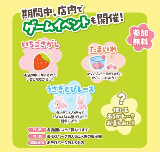 「いちごさがし」「たまいれ」「うさぎとびレース」など、店舗ごとに異なる内容でお楽しみいただけます。