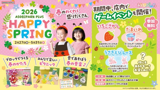 株式会社バンダイナムコエクスペリエンスは「あそびパークPLUS」全12店舗にて、2026年2月27日(金)~5月31日(日)の期間、春を楽しむイベント『HAPPY SPRING』を開催します。