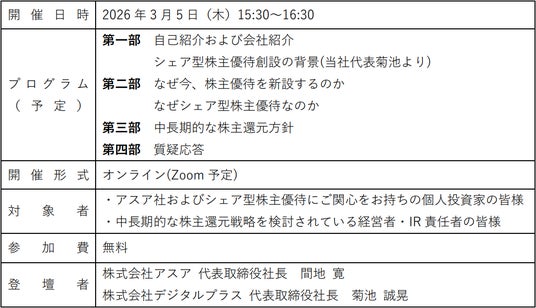アスア社の株主の皆様はもちろん、投資をご検討中の個人投資家の皆様、さらに中長期的な株主還元戦略をお考えの経営者・IR担当者の皆様にもご参考にしていただける内容です。