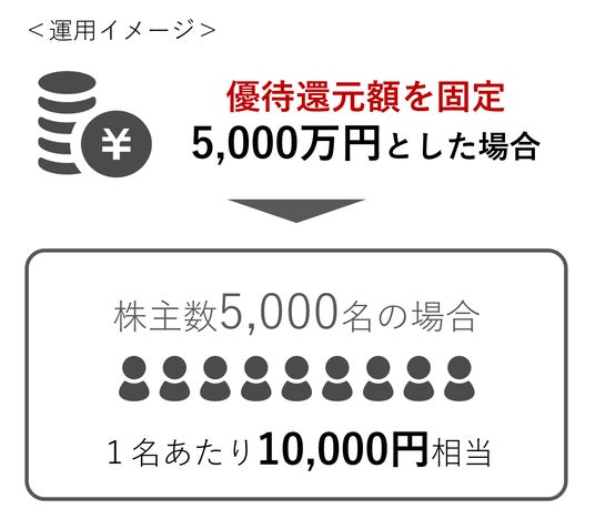 「シェア型株主優待」は、導入企業があらかじめ優待還元額を確定し、対象株主で等しく分け合う仕組みです。株主数の増減に左右されず優待還元額が維持されるため、株主の皆様にとって将来にわたって見通しの立ちやすい、持続性ある還元を受けられる点が特長です。