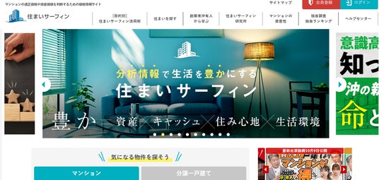 住まいサーフィン サイト概要マンションの適正価格や資産価値を判断するための価格情報サイト。2004年より会員制に移行し、マンションの売買をする時に知りたい情報を”見える化”、購入・売却検討者が知ることが難しかった不動産情報を提供し、持ち家取得を後押ししている。マンションの査定価格・相場情報と会員の物件評価・デベロッパー評価などの豊富なコンテンツを持つ。中古マンション販売データ約280万件、賃貸データ約1億件を保有し、会員数は31万人(2024年10月時点)を超える業界最大級の不動産ビッグデータカンパニーとして、不動産情報を調査・分析するスタイルアクト株式会社が運営している。