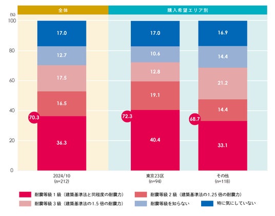 また、新築マンションに求める耐震基準(※1)についての調査結果を見てみると、消費者が望む耐震基準と実際に提供されている基準には明らかな違いがあることが分かりました。近年、大きな地震が複数回発生していることから、消費者の地震への関心が高まり、安全性を重視する傾向が強まっています。実際、約30%の方が耐震等級2以上を求めていると回答しています。