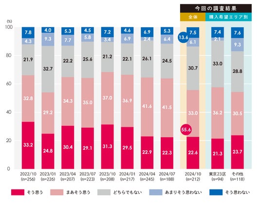 また、「金利が上がる前にマンションを購入したい」と考える割合は全体の55.6%と、1年前と比較して約10%減少し、金利上昇の現実を受け止める消費者の心理を反映していると言えそうです。