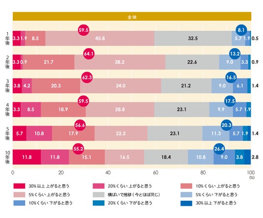 ≪ポイント≫10年後55.2%がさらに価格が上がると予想、上昇割合では価格が今より30%以上あがるとの回答が11.8%、未だ先高観が強い結果となった