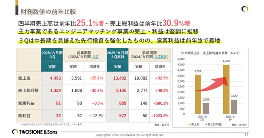 株式会社TWOSTONE&Sons(所在地:東京都渋谷区、代表取締役CEO:河端保志、代表取締役COO:高原克弥、証券コード:7352、以下 当社)は、本日2025年7月14日、2025年8月期 第3四半期決算を発表しました。