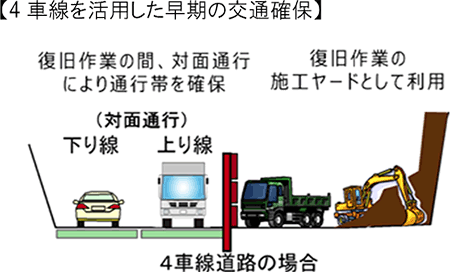⇒応急対策を実施のうえ、4車線のうち下り線を活用した対面交通により、復旧作業を行いながら、交通の確保 を実施しました。