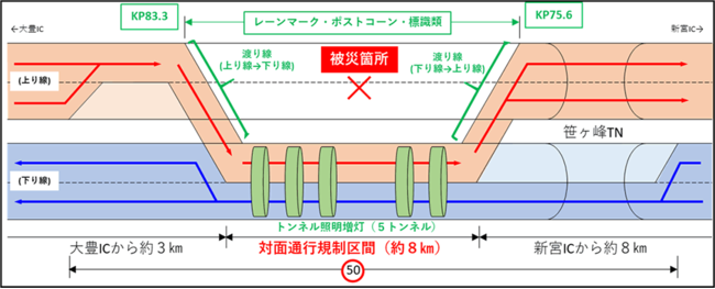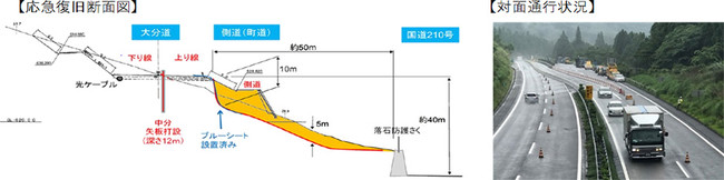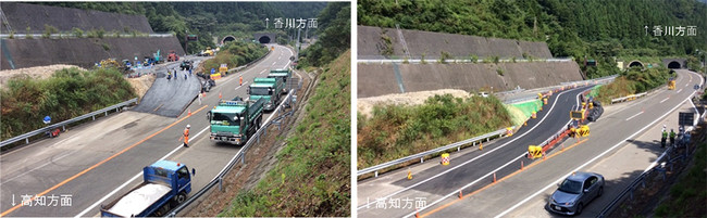 ⇒応急対策を実施のうえ、4車線のうち下り線を活用した対面交通により、復旧作業を行いながら、交通の確保を実施しました。