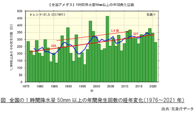 ◦最近10年間(2012~2021年)における1時間降水量50mm以上の平均年間発生回数(約327回)は、統計期間の 最初の10年間(1976~1985 年)の平均年間発生回数(約226回)と比べて約1.4倍に増加