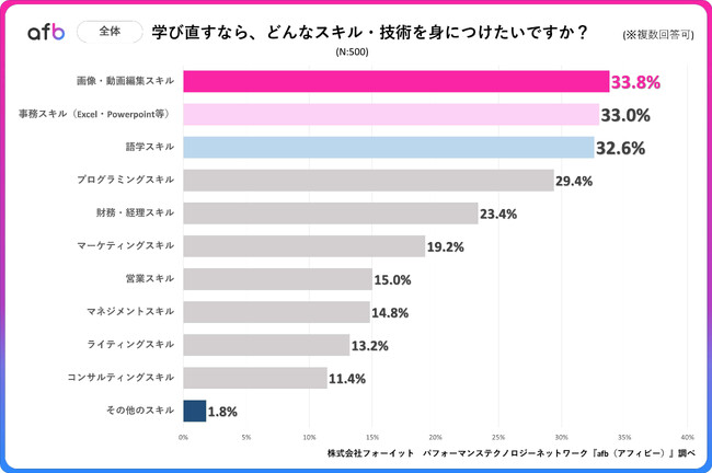 今回の調査では「学び直すとしたらどんなスキル・技術を身につけたいですか?」というアンケートを実施したところ、最も多かった回答は「画像・動画編集スキル」で33.8%という数字でした。次いで、「事務スキル(Excel・Powerpoint等)」が33.0%、「語学スキル」が32.6%と続くという結果になっています。