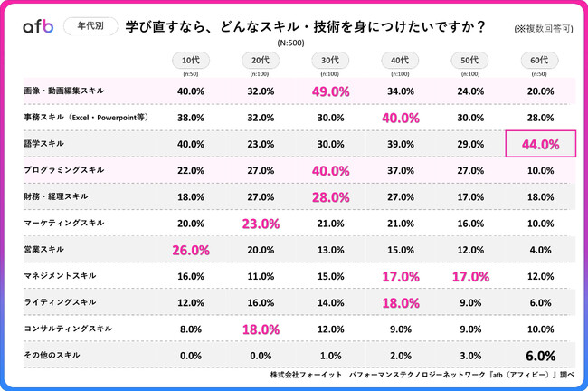 パフォーマンステクノロジーネットワーク「afb(アフィビー)」< https://www.afi-b.com/ >の開発運用をおこなう株式会社フォーイットは、全国の10代~60代までの男女500人を対象にリスキリングに関するアンケートを実施し、男女別・年代別等の特徴についてまとめました。