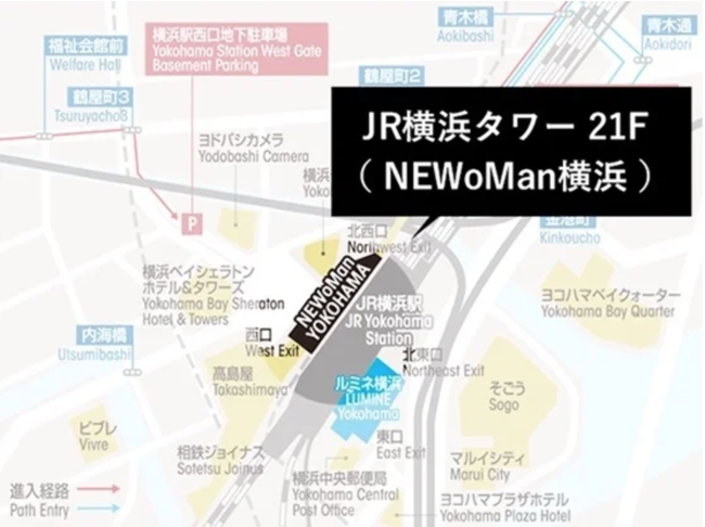 NEWoMan横浜12Fにて乗り継ぎ、21F迄お越しください。