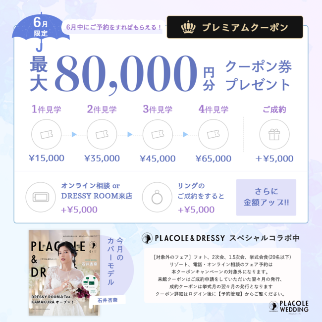 「PLACOLE & DRESSY」ブランドを展開する、冒険社プラコレ(本社:神奈川県鎌倉市、代表取締役CEO:武藤功樹)は、これからの結婚式準備をスタートされる花嫁さまへ向けた、6月ジューンブライド限定キャンペーンを開始いたしました。