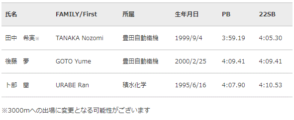 2023年5月21日(日)に日産スタジアムにて開催する「セイコーゴールデングランプリ陸上2023横浜」の、男子3000m・3000m障害物、女子1500m・3000mに出場を予定している選手を下記のとおりお知らせいたします。(2023年3月17日現在。)