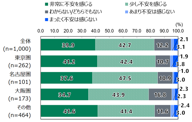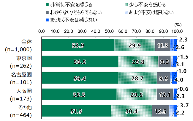 地球温暖化による災害の激甚化や、十数年内に発生する可能性が指摘されている大規模地震について、それぞれ8割以上の人が「不安を感じる」とし、危機感が見て取れます。しかし、地域の指定避難所等を知らない人は過半数に及び、「避難情報に関するガイドライン」の内容理解も2割以下に留まるなど、防災関連の制度・対策には一層の普及啓発が必要です。報告書に、より詳細な結果とグラフを掲載しています。是非、参照ください。
