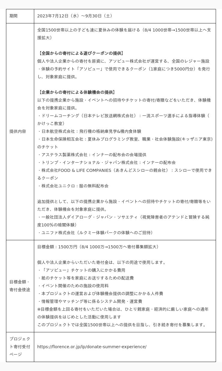今回の取り組みは、メインパートナーのアソビュー株式会社をはじめとして、複数の企業からの賛同と全国からの寄付を原資に子どもたちに様々な体験を届けていく活動です。当初は寄付額1000万円を原資に全国1000世帯の子ども達に体験をプレゼントすることを目標として開始しましたが、ご家庭や寄付者の皆さんからの反響を受け、8月4日に支援世帯目標数を1000世帯から全国1500世帯以上に拡大し、寄付募集額も1000万円から1500万円に拡大しました。