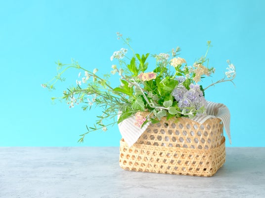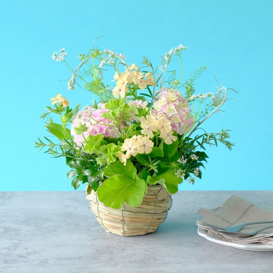 竹かごに布を敷き、コップなどにいけた花を入れるだけで、ちょっぴり和風の花あしらいのできあがりです。